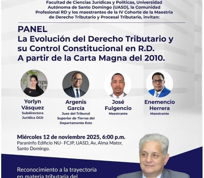 El evento contará con la participación de Yorlyn Vásquez, subdirectora jurídica de la DGII; Argenis García, juez del Tribunal Superior de Tierras del Departamento Este; y los maestrantes José Fulgencio y Enemencio Herrera, quienes aportarán una visión técnica y académica sobre el Derecho Tributario dominicano desde la reforma constitucional de 2010.